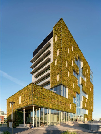 Das Gebäude wartet außerdem mit einem halboffenen begrünten Hof mit integrierter Pflanzkläranlage auf, dessen aufbereitetes Regenwasser für die Toilettenspülungen verwendet wird. Die begrünte Nordostfassade erstreckt sich über 200 m² und hilft bei der Verbesserung der Luftqualität. Zudem reguliert sie die Temperatur im Gebäude als Thermospeicher.